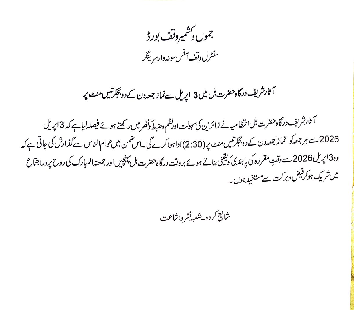 6 30-03-2026 Friday Prayer Timings at Assar-i-Sharief Hazratbal, 2026