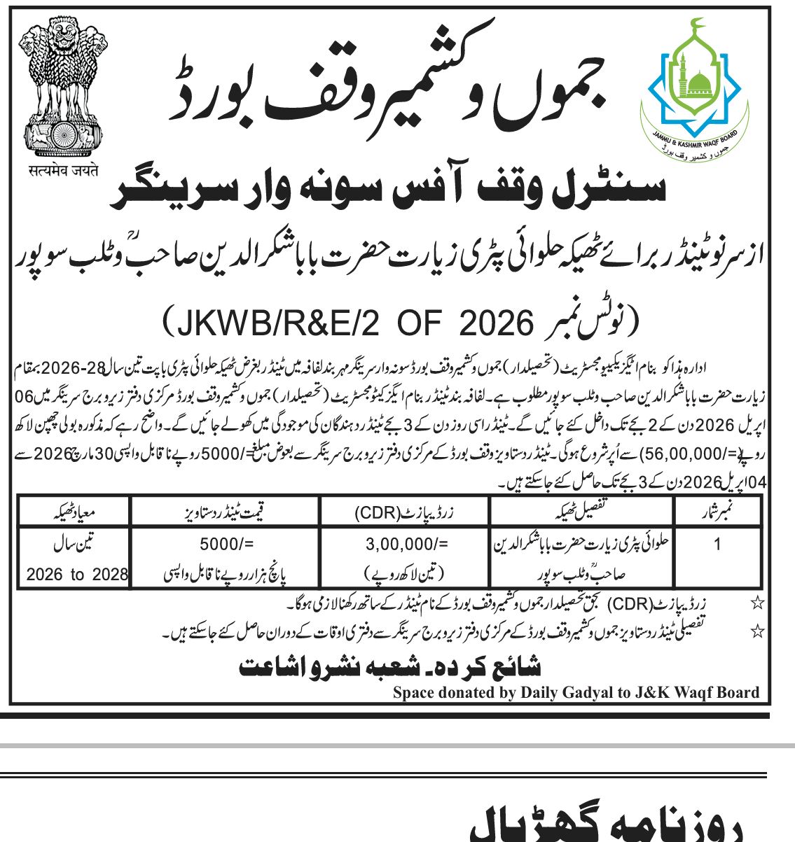 Tender Notice--Halwai Patri-Ziyarat Baba Shukur-ud-din Sahib Watlab